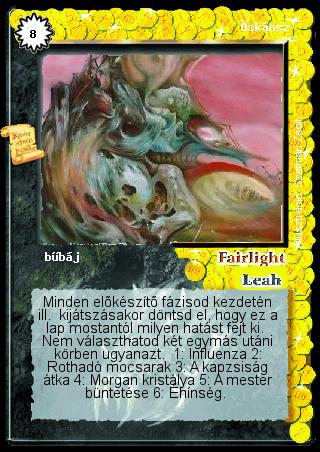 Kiadás: Isteni szövetség Gyakoriság: ultra ritka Lapszín (isten): Fairlight-Leah Típus: bűbáj Szöveg: Minden előkészítő fázisod kezdetén ill. kijátszásakor döntsd el, hogy ez a lap mostantól milyen hatást fejt ki. Nem választhatod két egymás utáni körben ugyanazt. 1: Influenza 2: Rothadó mocsarak 3: A kapzsiság átka 4: Morgan kristálya 5: A mester büntetése 6: Éhínség. Illusztráció: Szatmári Zsolt