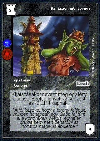 Kiadás: Sötét Föld (Invázió) Gyakoriság: ritka Lapszín (isten): Leah Típus: építmény Altípus: torony Szöveg: Kijátszásakor nevezz meg egy lény altípust. Ezek a lények -2 sebzést és -2 ÉP-t kapnak. Szinesítő szöveg: "Attól kezdve, hogy a torony felépült, minden hónapban egy újabb faj tűnt el a környéken. Mégis, egyetlen druida sem mert behatolni az irtózatos mágikus épületbe." Illusztráció: Mayer László