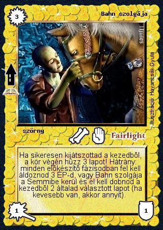 Kiadás: Feledés tornya (Zén) Gyakoriság: ritka Lapszín (isten): Fairlight Típus: szörny Szöveg: Ha sikeresen kijátszottad a kezedből, a kör végén húzz 3 lapot! Hátrány: minden előkészítő fázisodban fel kell áldoznod 3 ÉP-d, vagy Bahn szolgája a Semmibe kerül és el kell dobnod a kezedből 2 általad választott lapot (ha kevesebb van, akkor annyit). Illusztráció: Havancsák Gyula