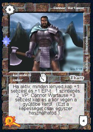 Kiadás: Ezüsthajnal Gyakoriság: ritka Lapszín (isten): Tharr Típus: kalandozó Altípus: ember Szöveg: Ha aktív, minden lényed kap +1 sebzést és +1 ÉP-t. 1 szintlépés: 2 VP: Connor Wartause +3 sebzést kap és a kör végén a gyűjtőbe kerül. (Ezt a képességet csak egyszer használhatod.). Illusztráció: Szász Gábor