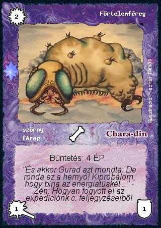 Kiadás: Ezüsthajnal Gyakoriság: gyakori Lapszín (isten): Chara-din Típus: szörny Altípus: féreg Szöveg: Büntetés: 4 ÉP. Szinesítő szöveg: "És akkor Gurad azt mondta: De ronda ez a hernyó! Kipróbálom, hogy bírja az energiatüskét..." - Zén: Hogyan fogyott el az expedíciónk c. feljegyzéseiből Illusztráció: Fischer Tamás