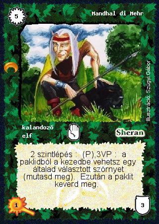 Kiadás: Chara-din visszatér Gyakoriság: ritka Lapszín (isten): Sheran Típus: kalandozó Altípus: elf Szöveg: 2 szintlépés: (P),3VP: a paklidból a kezedbe vehetsz egy általad választott szörnyet (mutasd meg). Ezután a paklit keverd meg. Illusztráció:
