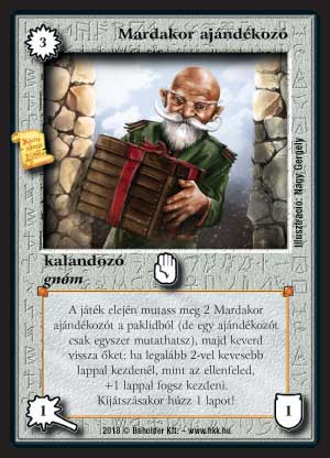 Kiadás: Elemi erők Gyakoriság: ultra ritka Lapszín (isten): Színtelen Típus: kalandozó Altípus: gnóm Szöveg: A játék elején mutass meg 2 Mardakor ajándékozót a paklidból "(de egy ajándékozót csak egyszer mutathatsz), majd keverd vissza őket: ha legalább 2-vel kevesebb lappal kezdenél, mint az ellenfeled, +1 lappal fogsz kezdeni. Kijátszásakor húzz 1 lapot! Illusztráció: Nagy Gergely
