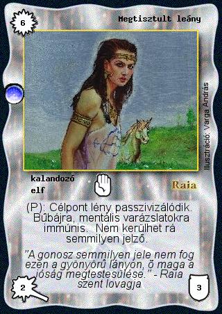 Kiadás: Árnyékhold Gyakoriság: nem gyakori Lapszín (isten): Raia Típus: kalandozó Altípus: elf Szöveg: (P): Célpont lény passzivizálódik. Bűbájra, mentális varázslatokra immúnis. Nem kerülhet rá semmilyen jelző. Szinesítő szöveg: "A gonosz semmilyen jele nem fog ezen a gyönyörű lányon, ő maga a jóság megtestesülése." - Raia szent lovagja Illusztráció: Varga András