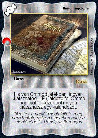 Kiadás: Két világ közt Gyakoriság: nem gyakori Lapszín (isten): Raia Típus: tárgy Szöveg: Ha van Ommód játékban, ingyen kijátszhatod. (P), áldozd fel Ommó naplóját: a kezedből ingyen kijátszhatsz egy kalandozót. Szinesítő szöveg: "Amikor a naplót megtaláltuk, még nem tudtuk, milyen hihetetlen nagy a jelentősége." - Pondi, az ősmágus Illusztráció: Szász Gábor
