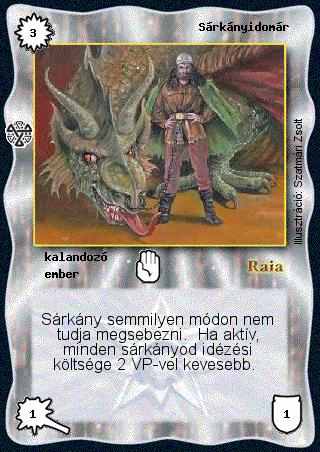 Kiadás: Isteni szövetség Gyakoriság: nem gyakori Lapszín (isten): Raia Típus: kalandozó Altípus: ember Szöveg: Sárkány semmilyen módon nem tudja megsebezni. Ha aktív, minden sárkányod idézési költsége 2 VP-vel kevesebb. Illusztráció: Szatmári Zsolt