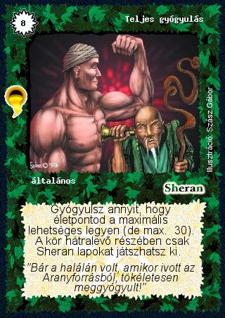 Kiadás: Aranyforrás Gyakoriság: ritka Lapszín (isten): Sheran Típus: általános Szöveg: Gyógyulsz annyit, hogy életpontod a maximális lehetséges legyen (de max. 30). A kör hátralevő részében csak Sheran lapokat játszhatsz ki. Szinesítő szöveg: "Bár a halálán volt, amikor ivott az Aranyforrásból, tökéletesen meggyógyult!" Illusztráció: Szász Gábor