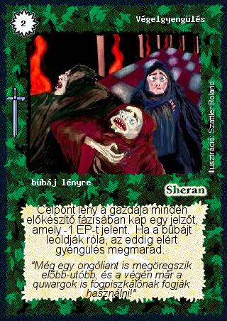 Kiadás: Hőskorszak Gyakoriság: gyakori Lapszín (isten): Sheran Típus: bűbáj lényre Szöveg: Célpont lény a gazdája minden előkészítő fázisában kap egy jelzőt, amely -1 ÉP-t jelent. Ha a bűbájt leoldják róla, az eddig elért gyengülés megmarad. Szinesítő szöveg: "Még egy ongóliant is megöregszik előbb-utóbb, és a végén már a quwargok is fogpiszkálónak fogják használni!" Illusztráció: Szattler Roland