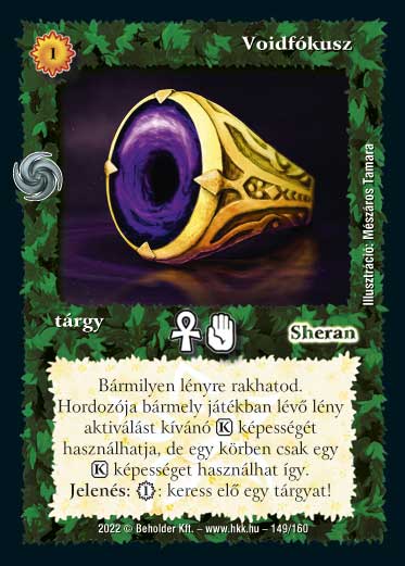 Ha egy Voidfókusszal felszerelt lény már használta a saját §¨ képességét, akkor a fókusz miatt akkor is használhatja újra. A Voidfókusz azt teszi lehetővé, hogy körönként egyszer kiválassz egy lényt az asztalról, és annak a §¨ képességét használja a hordozója, mintha a sajátja lenne. Az, hogy a lénynek van-e saját §¨ képessége, és azt használta-e, független a Voidfókusztól, tehát akár használhatja vele a saját képességét is még egyszer. Ha egy lényen több Voidfókusz van, mindegyik +1 §¨ képesség használatát teszi lehetővé.
