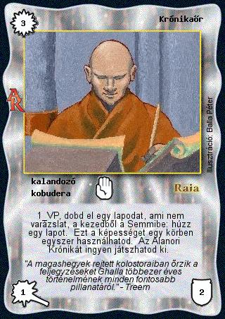 Kiadás: Alanori Krónika Gyakoriság: ritka Lapszín (isten): Raia Típus: kalandozó Altípus: kobudera Szöveg: 1 VP, dobd el egy lapodat, ami nem varázslat, a kezedből a Semmibe: húzz egy lapot. Ezt a képességet egy körben egyszer használhatod. Az Alanori Krónikát ingyen játszhatod ki. Szinesítő szöveg: "A magashegyek rejtett kolostoraiban őrzik a feljegyzéseket Ghalla többezer éves történelmének minden fontosabb pillanatáról." - Treem Illusztráció: Balla Péter