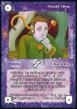 Kiadás: Alanori Krónika Gyakoriság: ritka Lapszín (isten): Chara-din Típus: szörny Altípus: féreg Szöveg: Hátrány: ha építkezni akarsz vele, el kell költened 2 VP-t. 4 VP: megnézheted egy célpont játékos kezében levő lapokat, és egy általad választott lapot a gyűjtőbe dobathatsz. Szinesítő szöveg: "Emlékezetkiesést okoz? Nos, így is lehet fogalmazni..." - Théroxi Sámuel Illusztráció: